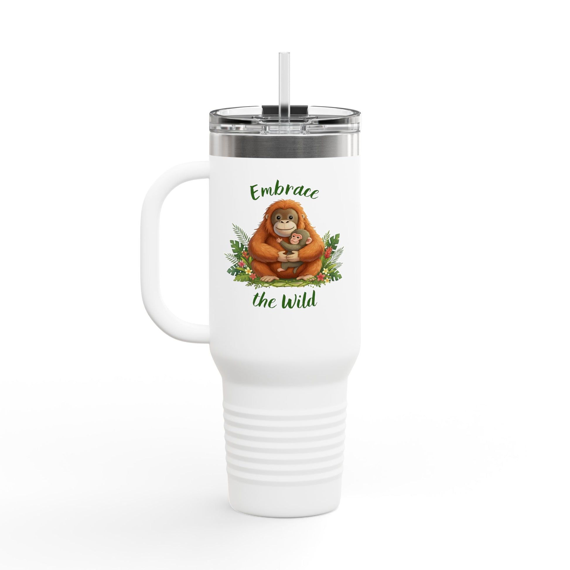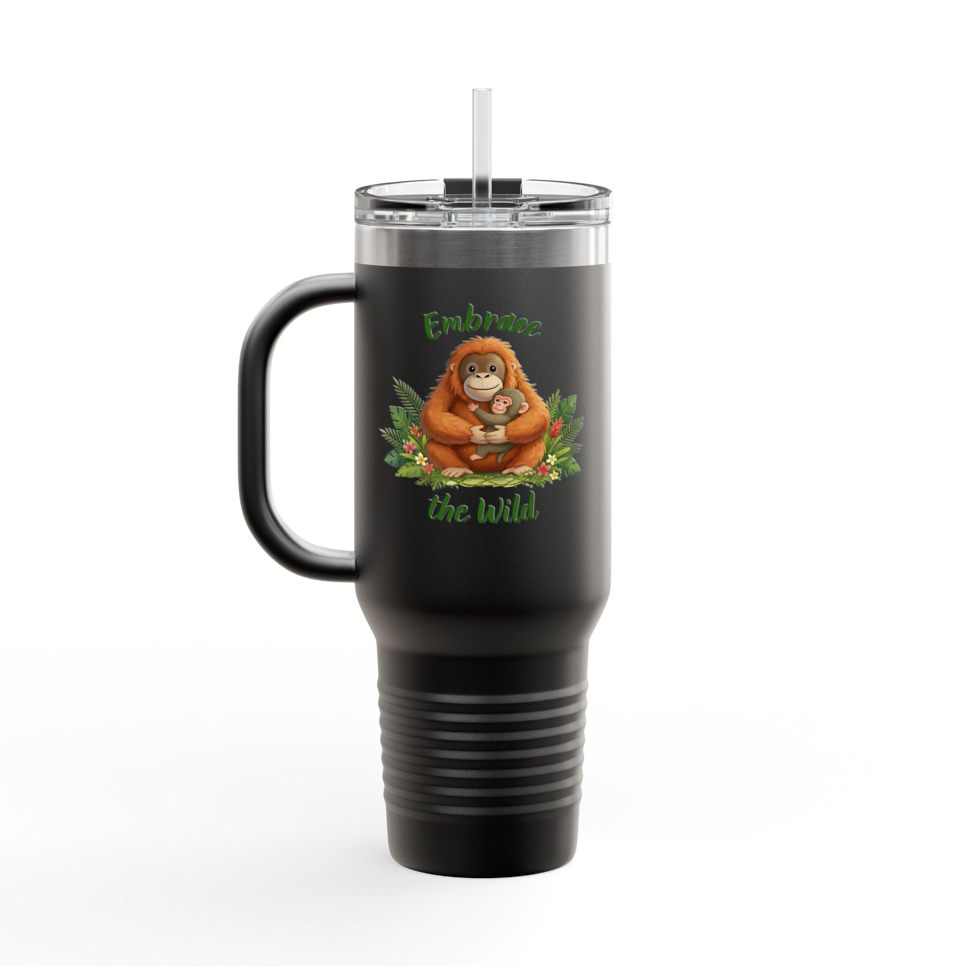 40oz Insulated Travel Mug — Orangutan hugging a Monkey - "Embrace the Wild" Design