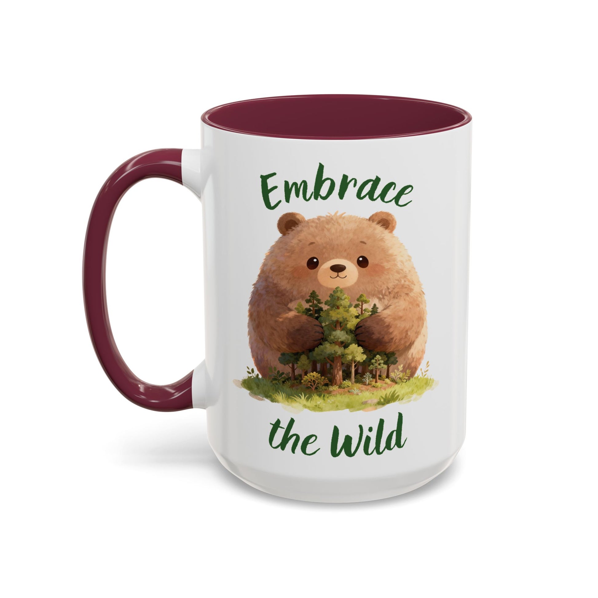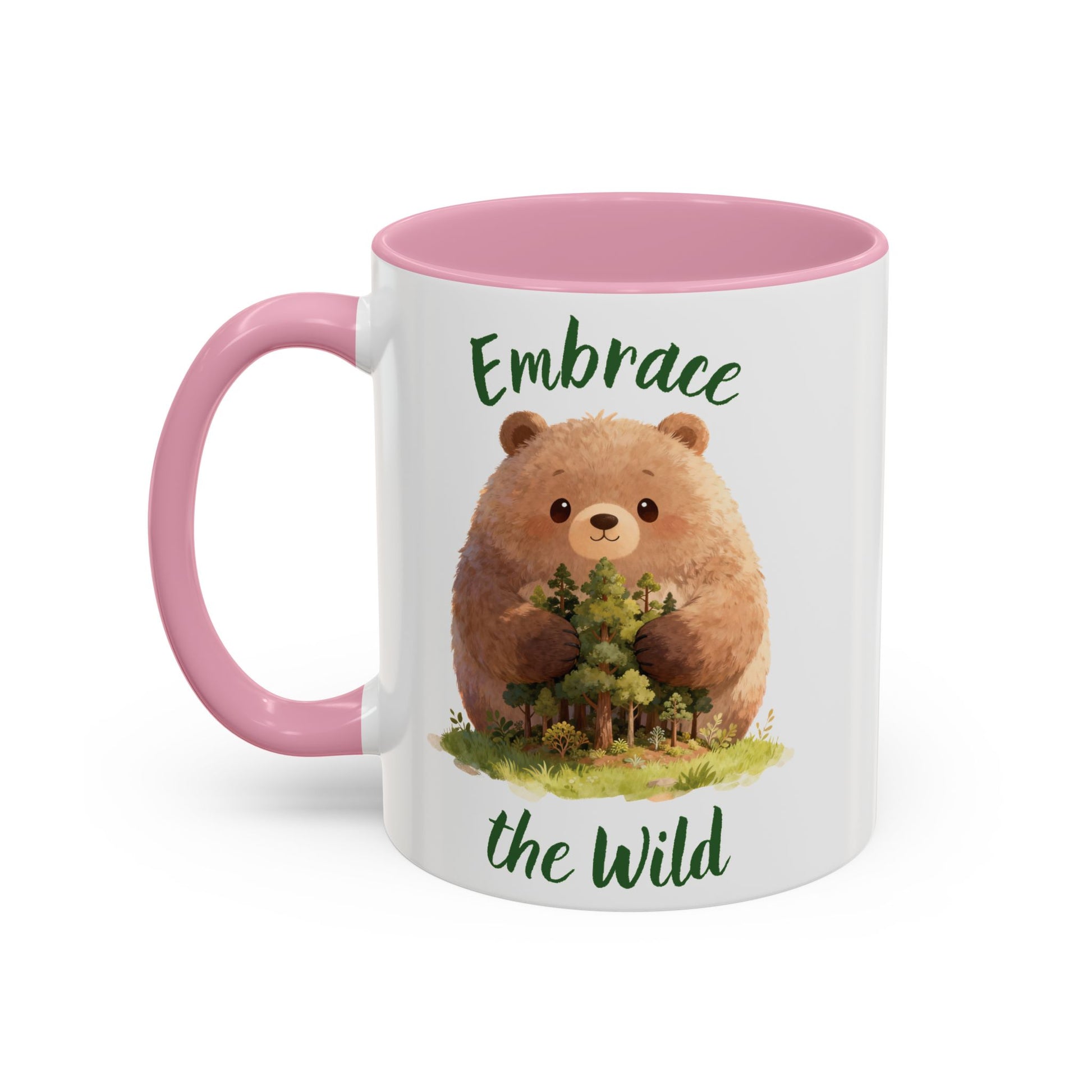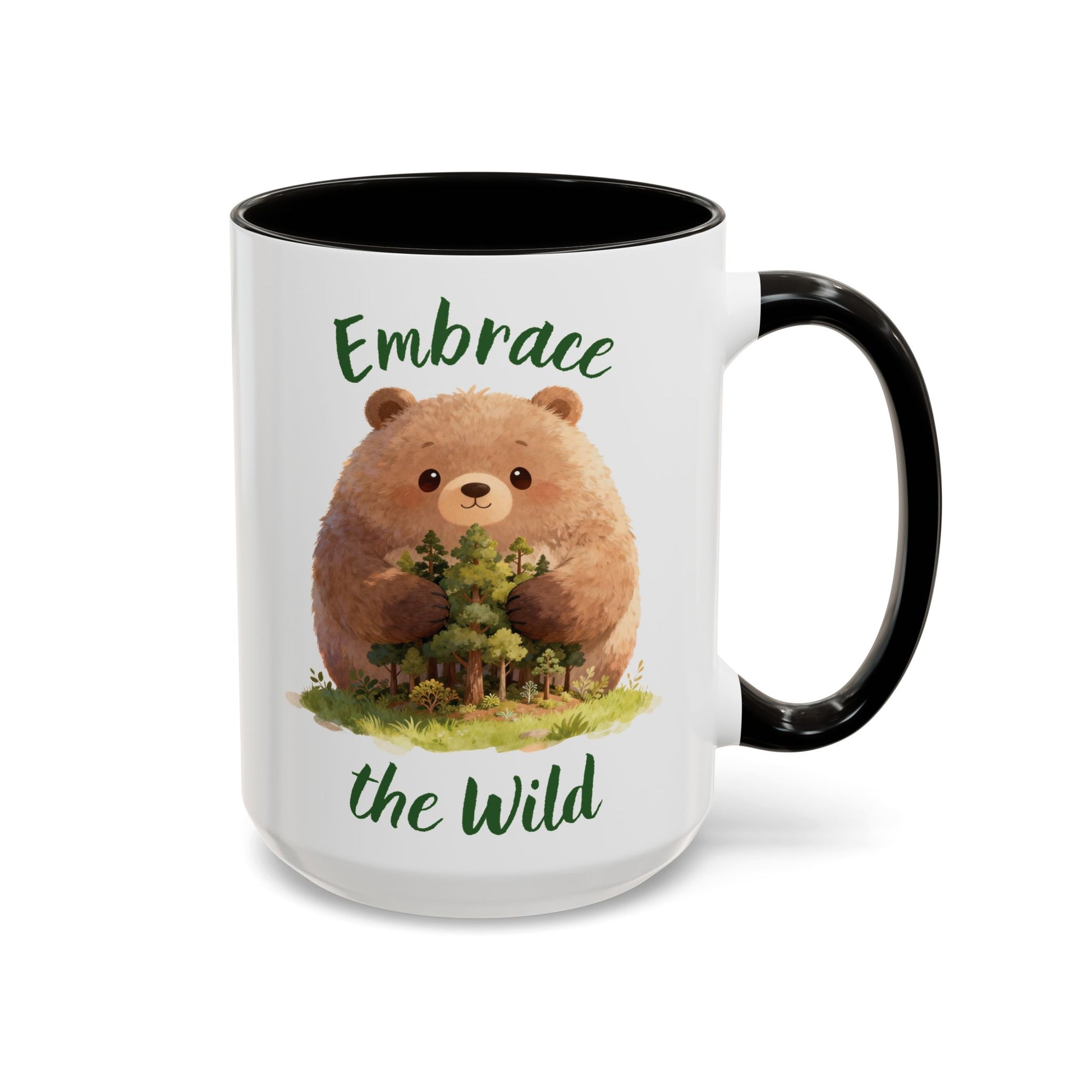 A cuddly bear cradles a tiny forest surrounded by the words “Embrace the Wild,” bringing a little woodland comfort to everyday mornings.