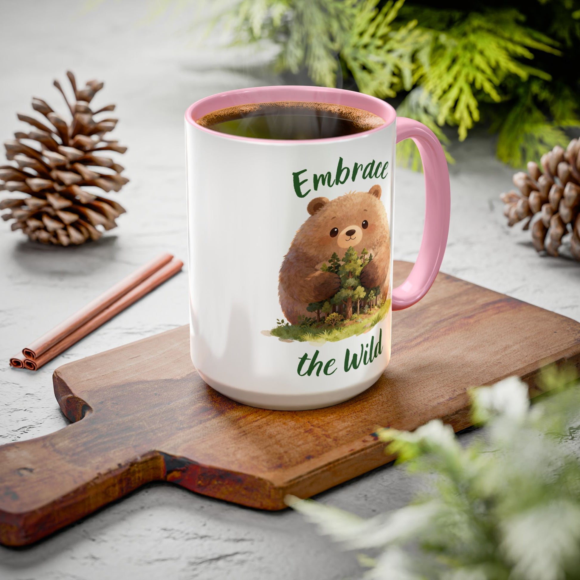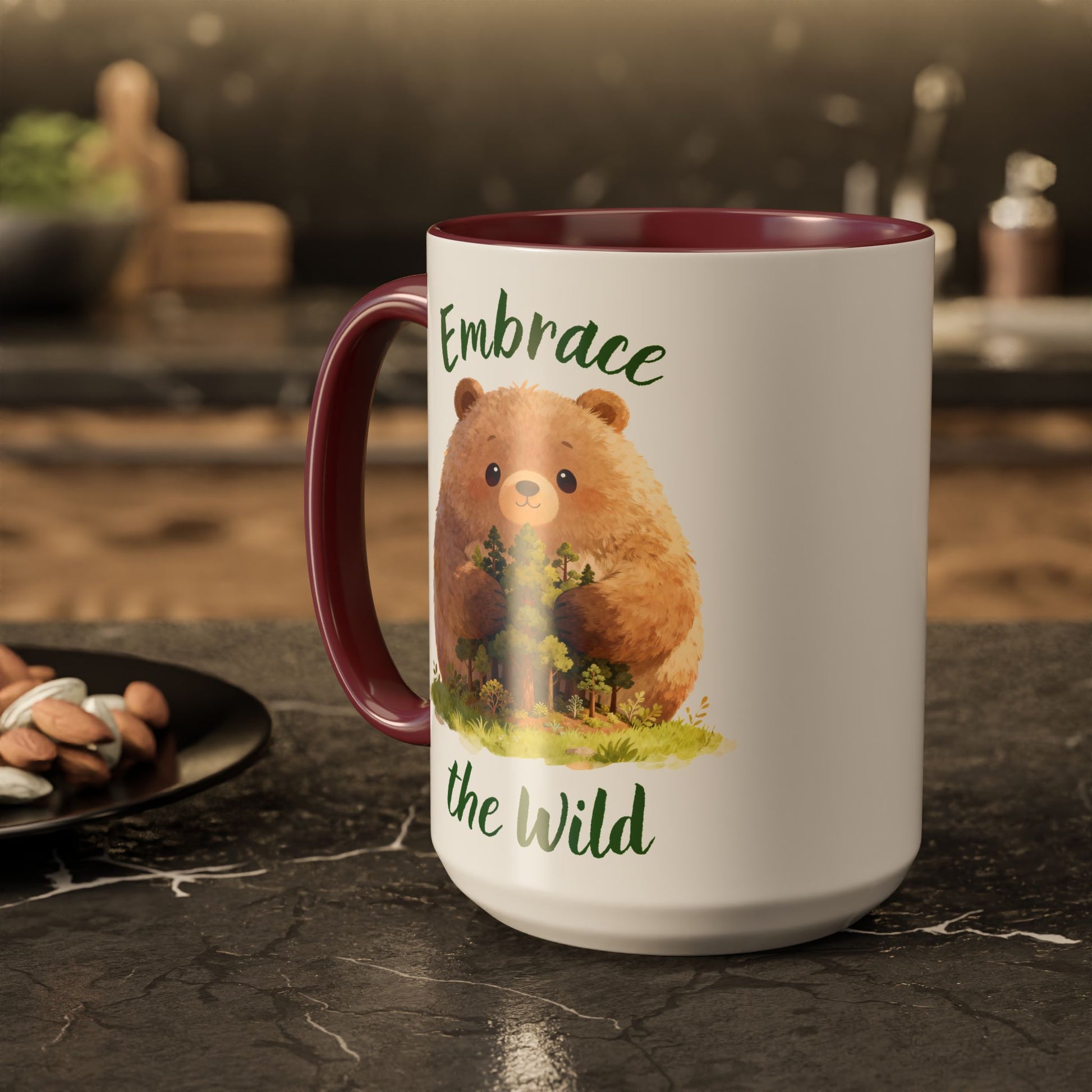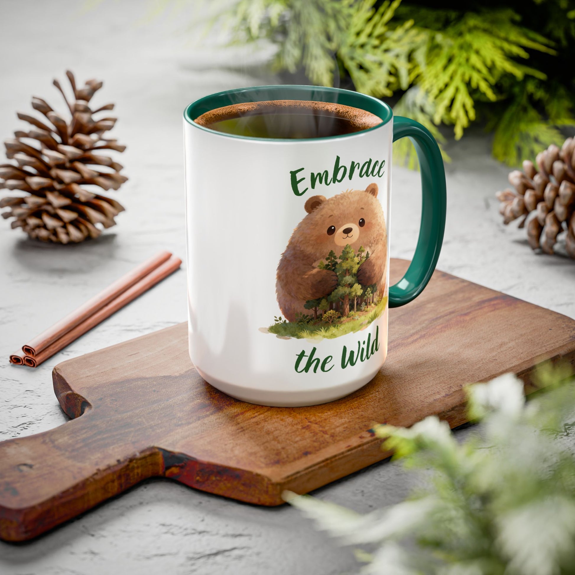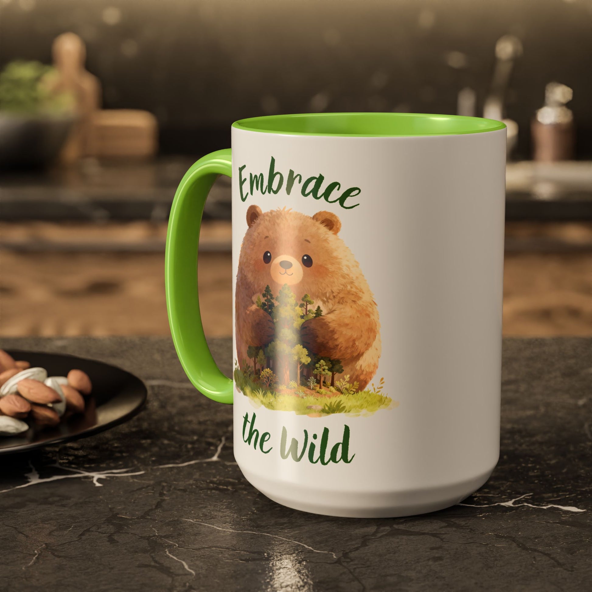 A cuddly bear cradles a tiny forest surrounded by the words “Embrace the Wild,” bringing a little woodland comfort to everyday mornings.